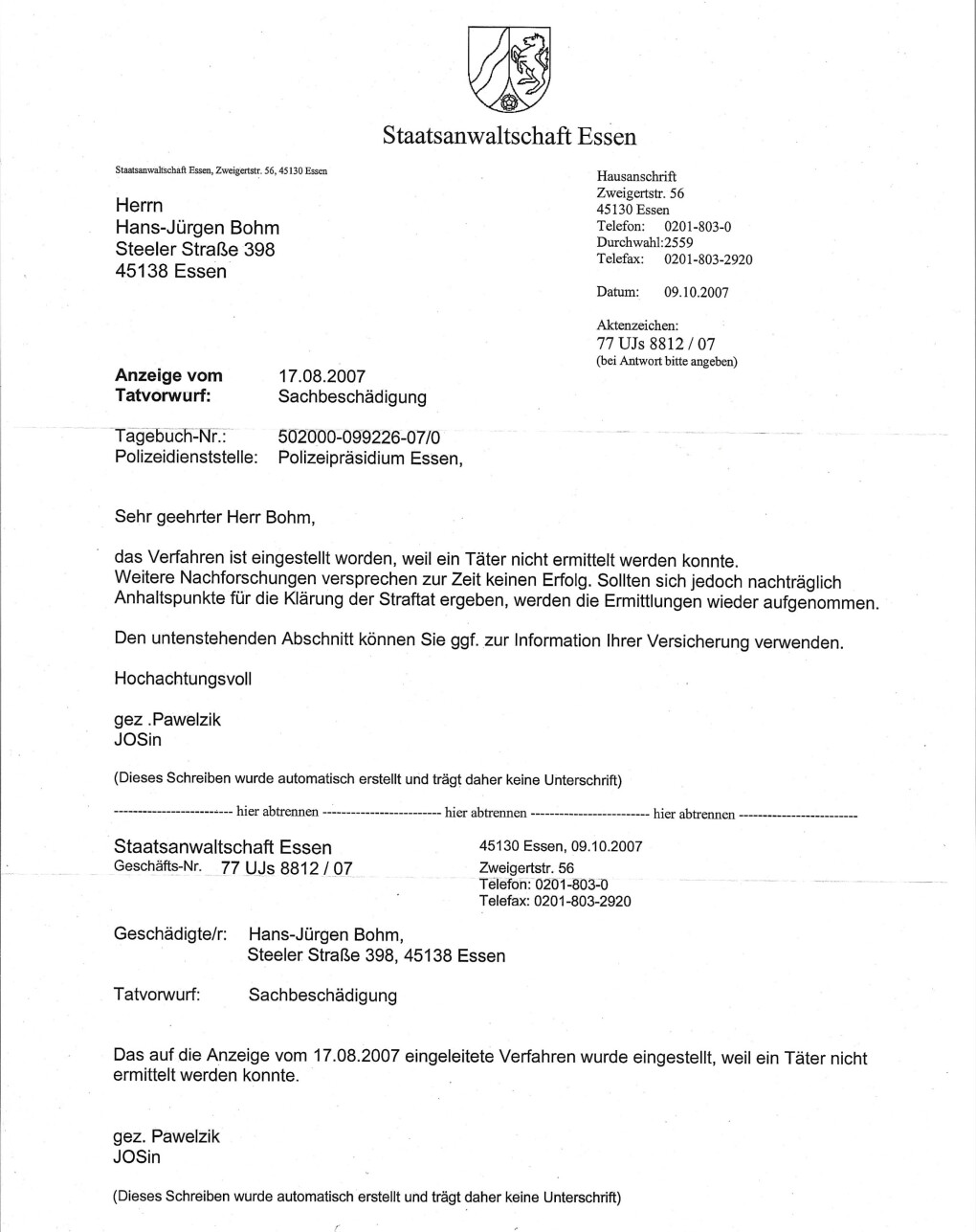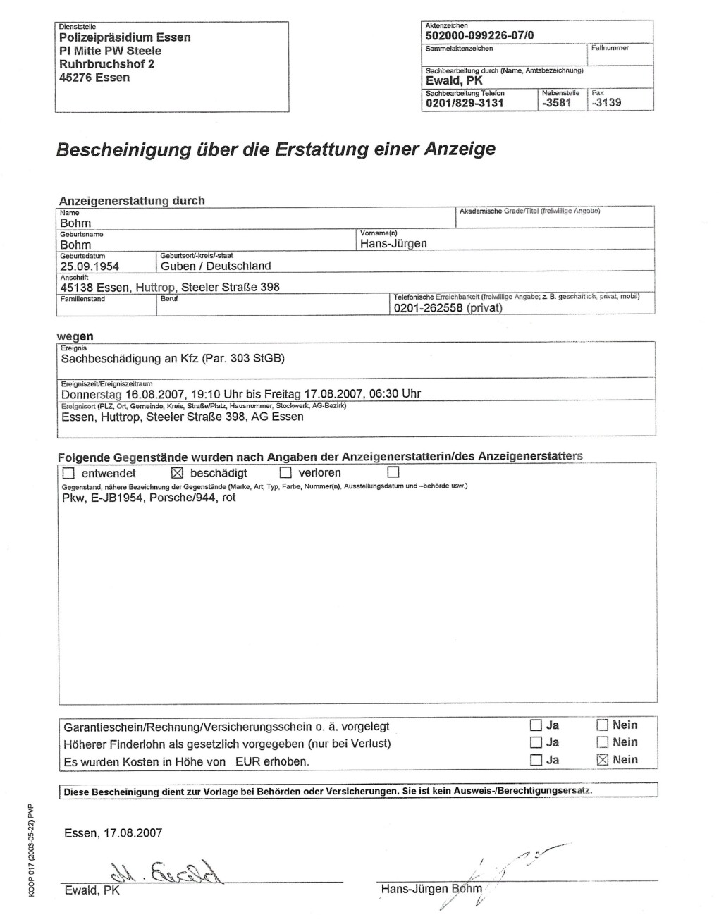 Beim Durchsehen alter Unterlagen bin ich noch auf eine Sachbeschädigung an meinem Porsche aus dem Jahr 2007 gestoßen.